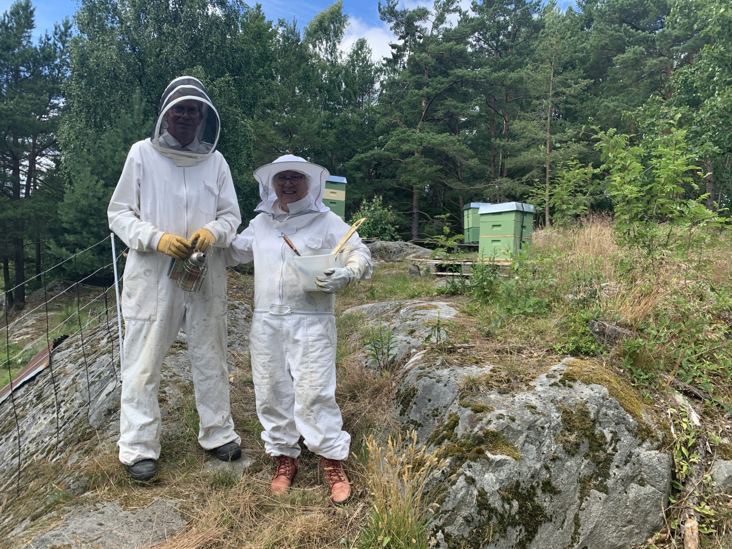 Biene var tidlig ute og luftet seg i solveggen. Pga. ferieturer og hendelser i fjor var vi på etterskudd med rengjøring av bi-utstyr. Vi har snekret sammen 3 vokssmeltere som fungere fint med Clas Olsons tapetdampere, så her gikk det unna med vokssmelting av gamle tavler. Deretter kokte Knut Olav bunnbrett og rammer i sterkt vaskevann for desinfeksjon, mens jeg vasket kubene i samme oppløsning men i lunka vann og malte kassene etterpå.