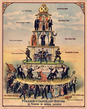 Klassemodellen framstilt som en pyramide der flertallet (arbeider- eller underklassen) må arbeide for å underholde de høyere klassene. Tegning fra 1911.
