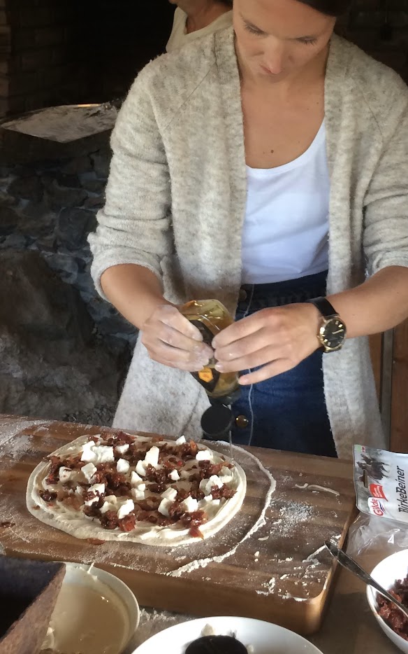 Valgfri pizzabunn til langpanne, 1 pk. Snøfrisk, 4 ss Creme fraiche,1 rød chili, en halv rødløk, 4 ss soltørket tomat, 1 fersk mozzarella, spekeskinke, pinjekjerner, honning, ruccola, salt og pepper etter smak.