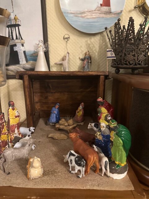 Den gamle julekrybben Audun og jeg lagde den første julen her ute i Kalvesund, mens Knut Olav var på jobb i Nordsjøen, har hedesplassen. Figurene er støpt av gips, malt og lakket. De har hold seg godt, men her for noen år siden gikk Josef i knas og en av gjeterne måtte overta den rollen. Trauet med Jesus-barnet ble for mange år siden skiftet ut med et eksemplar i utskåret oliventre kjøpt i Betlehem. I åras løp har det også vært en del andre dyr og vesener i denne stallen; hest, okse og asen, men også noen geiter, små dinosaurer og legomenn. Den himmelfalne sauen har jeg spesielt sans for.